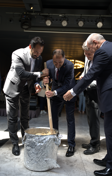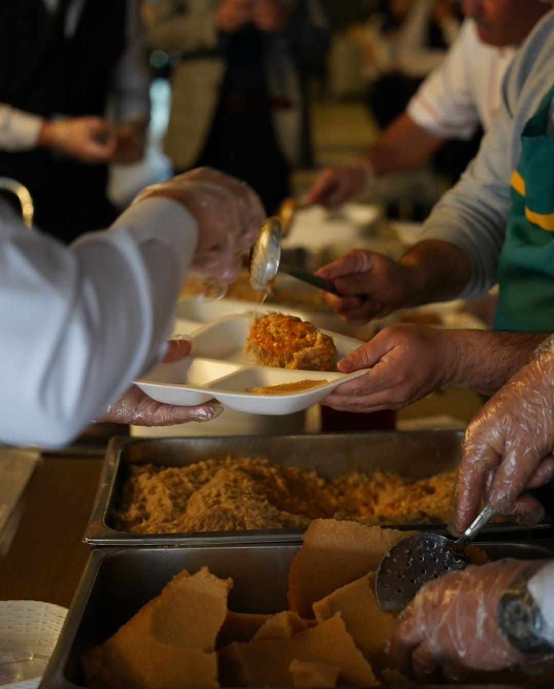 Zeybek gösterisinin ardından katılımcılar, geleneksel keşkek dövme törenine tanıklık etti. Dualar eşliğinde dövülen keşkek, sonrasında salonda bulunan misafirlere ikram edildi.